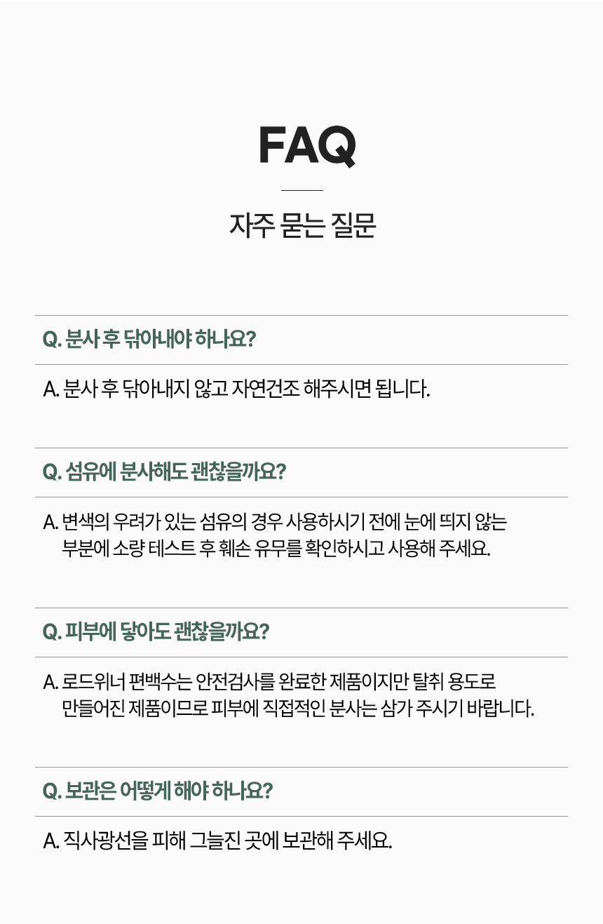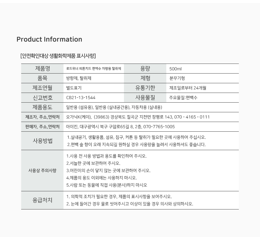 [사용상 주의사항] 1. 사용전 사용 방법과 용도를 확인하여 주시오. 2. 서늘한 곳에 보관하여 주시오. 3. 어린이의 손이 닿지 않는 곳에 보관하여 주시오. 4. 제품의 용도 이외에는 사용하지 마시오. 5.사람 또는 동물에 직접 사용(분사)하지 마시오 [응급처치] 1. 의학적 조치가 필요한 경우, 제품의 표시사항을 보여주시오. 2. 눈에 들어간 경우 물로 씻어주시고 이상이 있을 경우 의사와 상의하시오.