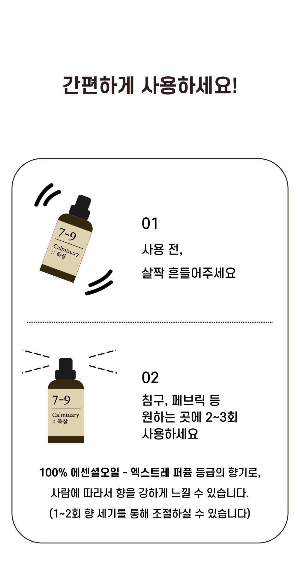 1. 사람 또는 동물 직접 사용(분사)하지 마시오. 2. 피부가 민감하거나 손상된 사람은 제품을 장기간 접촉하지 않도록 주의하시오.