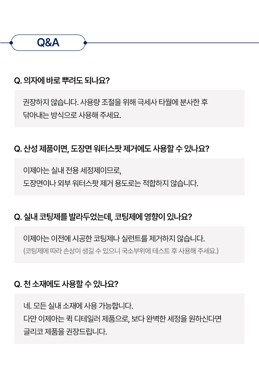 표시사항에 기재된 제품의 용도 외에는 사용하지 마시오. 다른 제품과 섞어 사용할 경우 인체에 치명적인 손상을 입힐 수 있으니 섞어 사용하지 마시오. 피부가 민감하거나 손상된 사람은 제품을 장기간 접촉하지 않도록 주의하시오. 밀폐된 공간에서 사용시 환기를 충분히 하시오. 제품을 눕혀서 보관 할 경우 누수의 위험이 있을 수 있으니 반드시 세워 보관하시오.