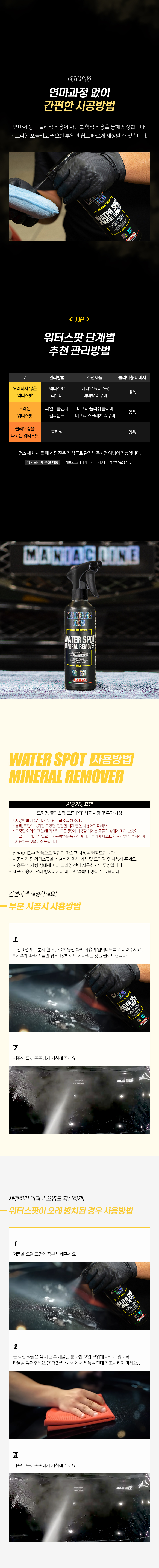 밀폐된 공간에서 사용시 환기를 충분히 하시오. 장갑, 마스크 등 적절한 보호구를 착용하시오. 자동차 실내에서는 사용하지 마시오 피부가 민감하거나 손상된 사람은 제품을 장기간 접촉하지 않도록 주의하시오. 도장면이 뜨거울 때는 절대 도포하지 마시오. 유리, 거울에는 사용하지 마시오. 코팅처리가 되지 않은 자동차 도장에는 변색을 일으킬 우려가 있습니다. 도장면을 확인하고 사용하시오. 다른 제품과 섞어 사용할 경우 인체에 치명적인 손상을 입힐 수 있으니 섞어 사용하지 마시오. 표시사항에 기재된 제품의 용도 외에는 사용하지 마시오.