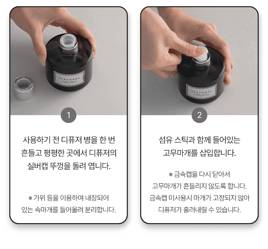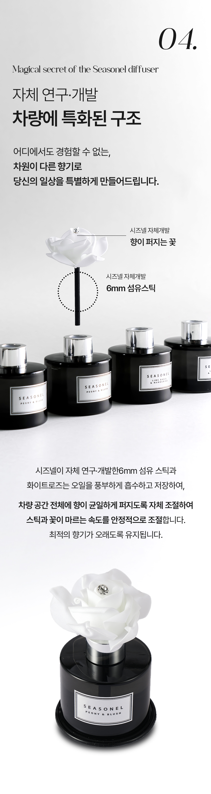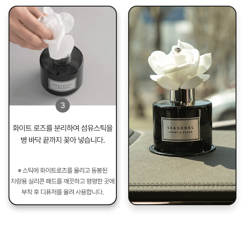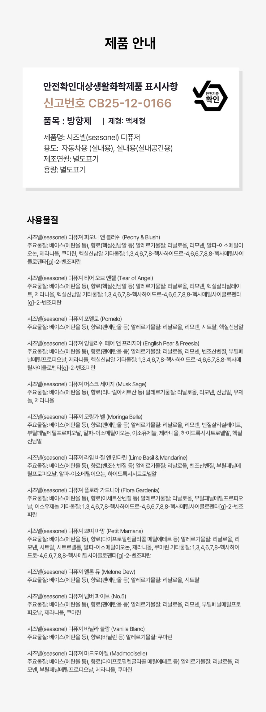 시즈넬(seasonel) 디퓨져 모링가 벨(Moringa Belle) 주요물질: 베이스(에탄올 등), 향료(펜에탄올 등) 알레르기물질: 리날로올, 리모넨, 벤질살리실레이트, 부틸페닐메칠프로피오날, 알파-이소메칠이오논, 이소유제놀, 제라니올, 하이드록시시트로넬알, 헥실신남알 시즈넬(seasonel) 디퓨져 넘버 파이브(No.5) 주요물질: 베이스(에탄올 등), 향료(펜에탄올 등) 알레르기물질: 리날로올, 리모넨, 부틸페닐메칠프로피오날, 제라니올, 쿠마린 시즈넬(seasonel) 디퓨져 라임 바질 앤 만다린(Lime Basil & Mandarine) 주요물질: 베이스(에탄올 등), 향료(벤조산벤질 등) 알레르기물질: 리날로올, 벤조산벤질, 부틸페닐메칠프로피오날, 알파-이소메칠이오논, 하이드록시시트로넬알 시즈넬(seasonel) 디퓨져 마드모아젤(Madmooiselle) 주요물질: 베이스(에탄올 등), 향료(다이프로필렌 글리콜 메틸 에테르 등) 알레르기물질: 리날로올, 리모넨, 부틸페닐메칠프로피오날, 제라니올, 쿠마린 시즈넬(seasonel) 디퓨져 머스크 세이지(Musk Sage) 주요물질: 베이스(에탄올 등), 향료(리나릴 아세트산 등) 알레르기물질: 리날로올, 리모넨, 신남알, 유제놀, 제라니올 시즈넬(seasonel) 디퓨져 멜론 듀(Melone Dew) 주요물질: 베이스(에탄올 등), 향료(펜에탄올 등) 알레르기물질: 리날로올, 시트랄 시즈넬(seasonel) 디퓨져 바닐라 블랑(Vanilla Blanc) 주요물질: 베이스(에탄올 등), 향료(바닐린 등) 알레르기물질: 쿠마린 시즈넬(seasonel) 디퓨져 쁘띠 마망(Petit Mamans) 주요물질: 베이스(에탄올 등), 향료(다이프로필렌글리콜메틸에테르 등) 알레르기물질: 리날로올, 리모넨, 시트랄, 시트로넬롤, 알파-이소메칠이오논, 제라니올, 쿠마린 기타물질: 1,3,4,6,7,8-헥사하이드로-4,6,6,7,8,8-헥사메틸사이클로펜타g-2-벤조피란, 헥사에틸 테트라포스페이트 시즈넬(seasonel) 디퓨져 티어 오브 엔젤(Tear of Angel) 주요물질: 베이스(에탄올 등), 향료(헥실신남알 등) 알레르기물질: 리날로올, 리모넨, 벤질살리실레이트, 시트로넬롤, 제라니올, 헥실신남알 기타물질: 1,3,4,6,7,8-헥사하이드로-4,6,6,7,8,8-헥사메틸사이클로펜타g-2-벤조피란 시즈넬(seasonel) 디퓨져 포멜로(Pomelo) 주요물질: 베이스(에탄올 등), 향료(펜에탄올 등) 알레르기물질: 리날로올, 리모넨, 시트랄, 헥실신남알 시즈넬(seasonel) 디퓨져 플로라 가드니아(Flora Gardenia) 주요물질: 베이스(에탄올 등), 향료(아세트산 벤질 등) 알레르기물질: 리날로올, 부틸페닐메칠프로피오날, 유제놀 기타물질: 1,3,4,6,7,8-헥사하이드로-4,6,6,7,8,8-헥사메틸사이클로펜타g-2-벤조피란 시즈넬(seasonel) 디퓨져 피오니 앤 블러쉬(Peony & Blush) 주요물질: 베이스(에탄올 등), 향료(헥실신남알 등) 알레르기물질: 리날로올, 리모넨, 알파-이소메칠이오논, 제라니올, 쿠마린, 헥실신남알 기타물질: 1,3,4,6,7,8-헥사하이드로-4,6,6,7,8,8-헥사메틸사이클로펜타g-2-벤조피란 시즈넬(seasonel) 디퓨져 잉글리쉬 페어 앤 프리지아(English Pear & Freesia) 주요물질: 베이스(에탄올 등), 향료(펜에탄올 등) 알레르기물질: 리날로올, 리모넨, 벤조산벤질, 부틸페닐메칠프로피오날, 제라니올, 헥실신남알 기타물질: 1,3,4,6,7,8-헥사하이드로-4,6,6,7,8,8-헥사메틸사이클로펜타g-2-벤조피란