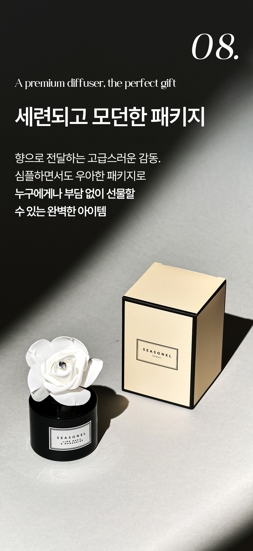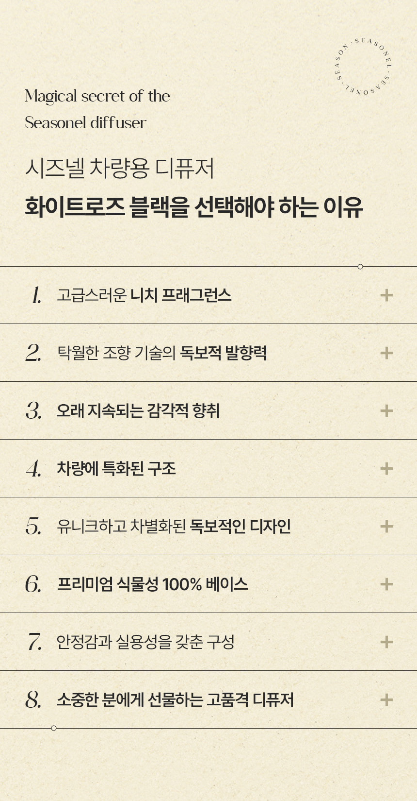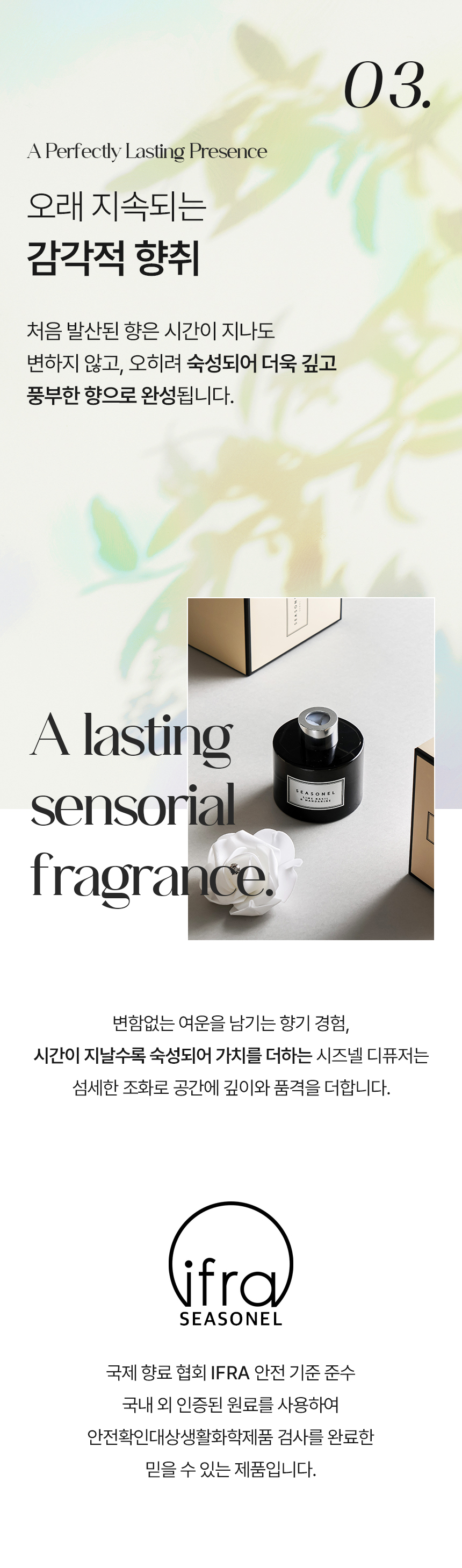 시즈넬(seasonel) 디퓨져 모링가 벨(Moringa Belle) 주요물질: 베이스(에탄올 등), 향료(펜에탄올 등) 알레르기물질: 리날로올, 리모넨, 벤질살리실레이트, 부틸페닐메칠프로피오날, 알파-이소메칠이오논, 이소유제놀, 제라니올, 하이드록시시트로넬알, 헥실신남알 시즈넬(seasonel) 디퓨져 넘버 파이브(No.5) 주요물질: 베이스(에탄올 등), 향료(펜에탄올 등) 알레르기물질: 리날로올, 리모넨, 부틸페닐메칠프로피오날, 제라니올, 쿠마린 시즈넬(seasonel) 디퓨져 라임 바질 앤 만다린(Lime Basil & Mandarine) 주요물질: 베이스(에탄올 등), 향료(벤조산벤질 등) 알레르기물질: 리날로올, 벤조산벤질, 부틸페닐메칠프로피오날, 알파-이소메칠이오논, 하이드록시시트로넬알 시즈넬(seasonel) 디퓨져 마드모아젤(Madmooiselle) 주요물질: 베이스(에탄올 등), 향료(다이프로필렌 글리콜 메틸 에테르 등) 알레르기물질: 리날로올, 리모넨, 부틸페닐메칠프로피오날, 제라니올, 쿠마린 시즈넬(seasonel) 디퓨져 머스크 세이지(Musk Sage) 주요물질: 베이스(에탄올 등), 향료(리나릴 아세트산 등) 알레르기물질: 리날로올, 리모넨, 신남알, 유제놀, 제라니올 시즈넬(seasonel) 디퓨져 멜론 듀(Melone Dew) 주요물질: 베이스(에탄올 등), 향료(펜에탄올 등) 알레르기물질: 리날로올, 시트랄 시즈넬(seasonel) 디퓨져 바닐라 블랑(Vanilla Blanc) 주요물질: 베이스(에탄올 등), 향료(바닐린 등) 알레르기물질: 쿠마린 시즈넬(seasonel) 디퓨져 쁘띠 마망(Petit Mamans) 주요물질: 베이스(에탄올 등), 향료(다이프로필렌글리콜메틸에테르 등) 알레르기물질: 리날로올, 리모넨, 시트랄, 시트로넬롤, 알파-이소메칠이오논, 제라니올, 쿠마린 기타물질: 1,3,4,6,7,8-헥사하이드로-4,6,6,7,8,8-헥사메틸사이클로펜타g-2-벤조피란, 헥사에틸 테트라포스페이트 시즈넬(seasonel) 디퓨져 티어 오브 엔젤(Tear of Angel) 주요물질: 베이스(에탄올 등), 향료(헥실신남알 등) 알레르기물질: 리날로올, 리모넨, 벤질살리실레이트, 시트로넬롤, 제라니올, 헥실신남알 기타물질: 1,3,4,6,7,8-헥사하이드로-4,6,6,7,8,8-헥사메틸사이클로펜타g-2-벤조피란 시즈넬(seasonel) 디퓨져 포멜로(Pomelo) 주요물질: 베이스(에탄올 등), 향료(펜에탄올 등) 알레르기물질: 리날로올, 리모넨, 시트랄, 헥실신남알 시즈넬(seasonel) 디퓨져 플로라 가드니아(Flora Gardenia) 주요물질: 베이스(에탄올 등), 향료(아세트산 벤질 등) 알레르기물질: 리날로올, 부틸페닐메칠프로피오날, 유제놀 기타물질: 1,3,4,6,7,8-헥사하이드로-4,6,6,7,8,8-헥사메틸사이클로펜타g-2-벤조피란 시즈넬(seasonel) 디퓨져 피오니 앤 블러쉬(Peony & Blush) 주요물질: 베이스(에탄올 등), 향료(헥실신남알 등) 알레르기물질: 리날로올, 리모넨, 알파-이소메칠이오논, 제라니올, 쿠마린, 헥실신남알 기타물질: 1,3,4,6,7,8-헥사하이드로-4,6,6,7,8,8-헥사메틸사이클로펜타g-2-벤조피란 시즈넬(seasonel) 디퓨져 잉글리쉬 페어 앤 프리지아(English Pear & Freesia) 주요물질: 베이스(에탄올 등), 향료(펜에탄올 등) 알레르기물질: 리날로올, 리모넨, 벤조산벤질, 부틸페닐메칠프로피오날, 제라니올, 헥실신남알 기타물질: 1,3,4,6,7,8-헥사하이드로-4,6,6,7,8,8-헥사메틸사이클로펜타g-2-벤조피란