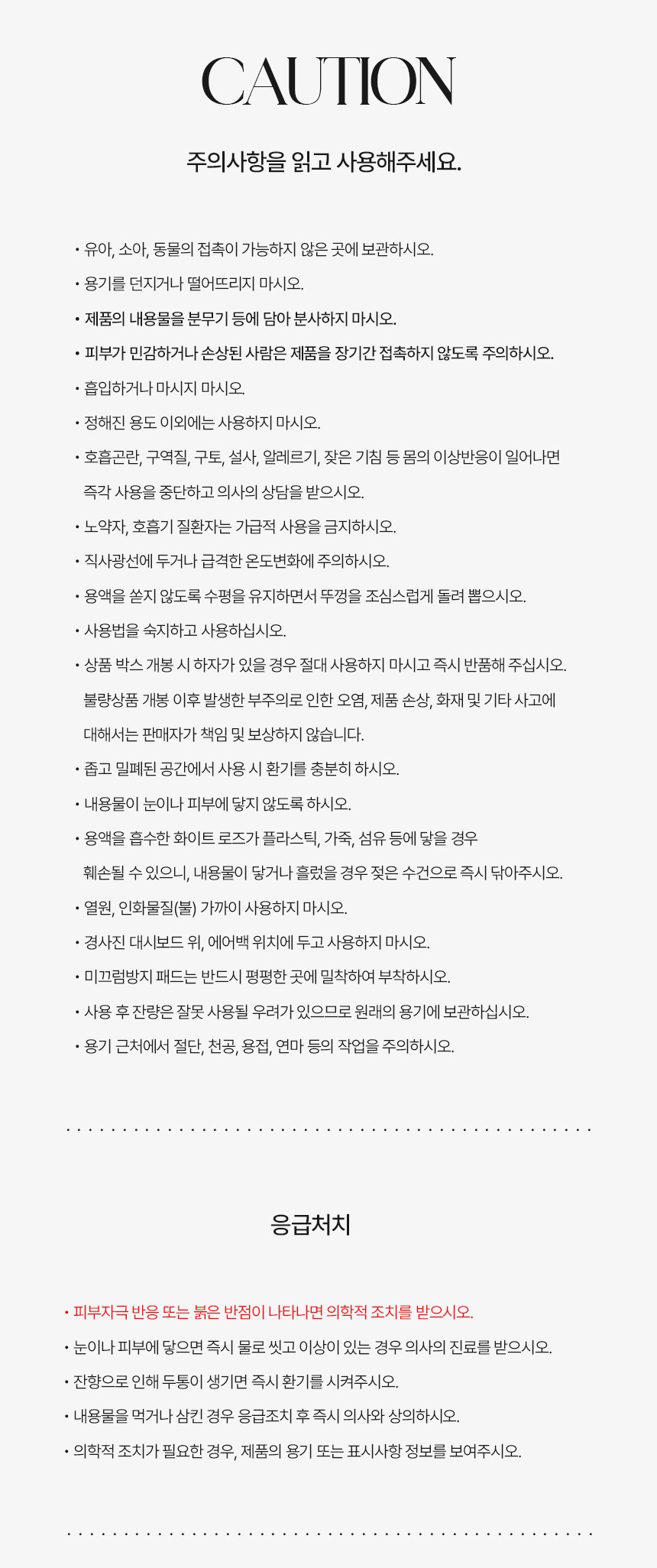 ㆍ어린이 손에 닿지 않는 곳에 보관하시오. ㆍ정해진 용도 이외에는 사용하지 마시오. ㆍ제품의 내용물을 분무기 등에 담아 분사하지 마시오. ㆍ용기와 결합된 뚜껑을 억지로 벗기지 마시오. ㆍ용기를 던지거나 떨어뜨리지 마시오. ㆍ흡입하거나 마시지 마시오. ㆍ피부가 민감하거나 손상된 사람은 제품을 장기간 접촉하지 않도록 주의하시오.